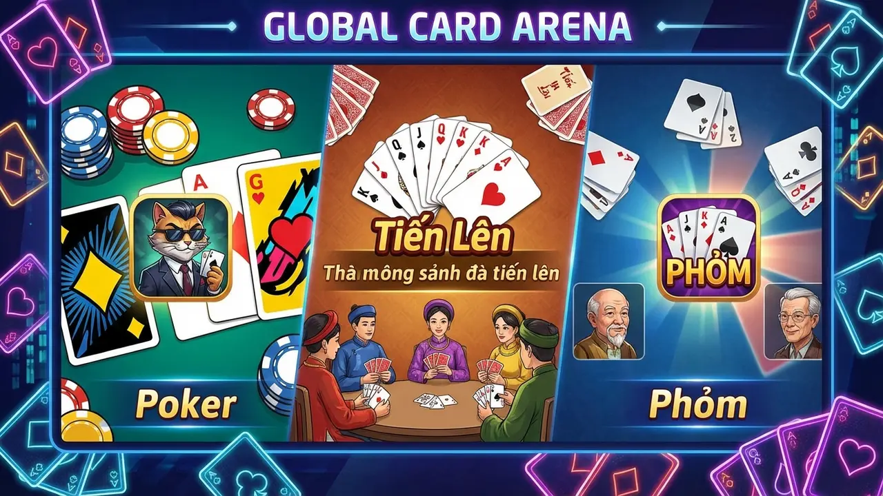 Logo của các game bài phổ biến như Tiến Lên, Phỏm, Mậu Binh, Poker được sắp xếp đẹp mắt.