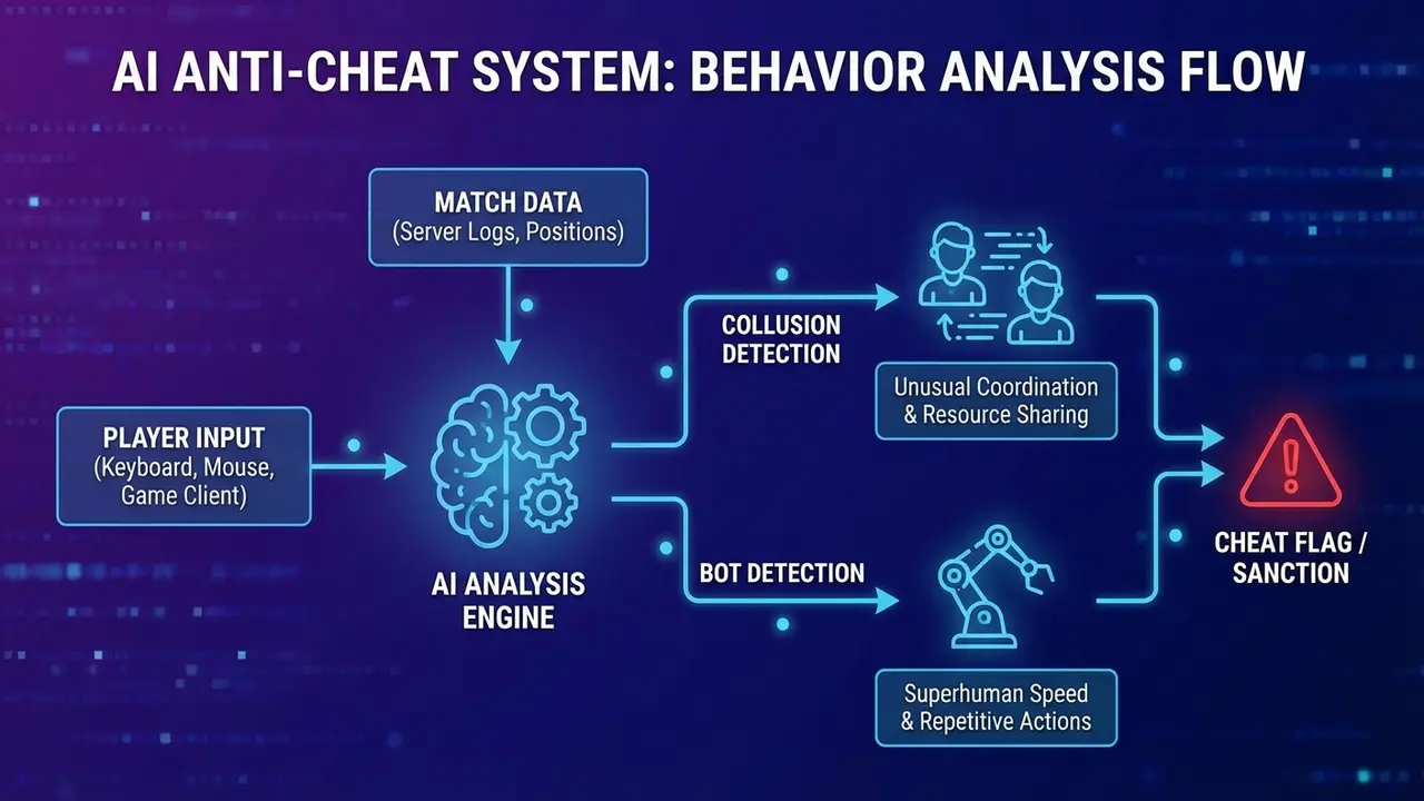 - Phân tích hành vi (Behavioral Analysis): AI liên tục học hỏi và phân tích hàng triệu ván đấu để xác định “hành vi chuẩn” của một người chơi bình thường. Bất kỳ tài khoản nào có lối chơi bất thường (ví dụ: tỷ lệ thắng đột biến, thời gian ra quyết định phi thực tế, lối đánh lặp đi lặp lại như máy) sẽ bị gắn cờ để theo dõi.