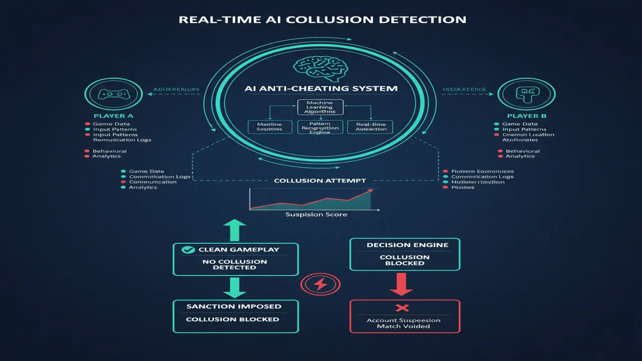 - Phát hiện thông đồng (Quây bài): Bằng cách phân tích lịch sử đối đầu và mối liên kết giữa các người chơi trong cùng một bàn, AI có thể xác định các nhóm tài khoản có hành vi cố tình “bơm” tiền cho nhau hoặc phối hợp để triệt hạ người chơi khác.