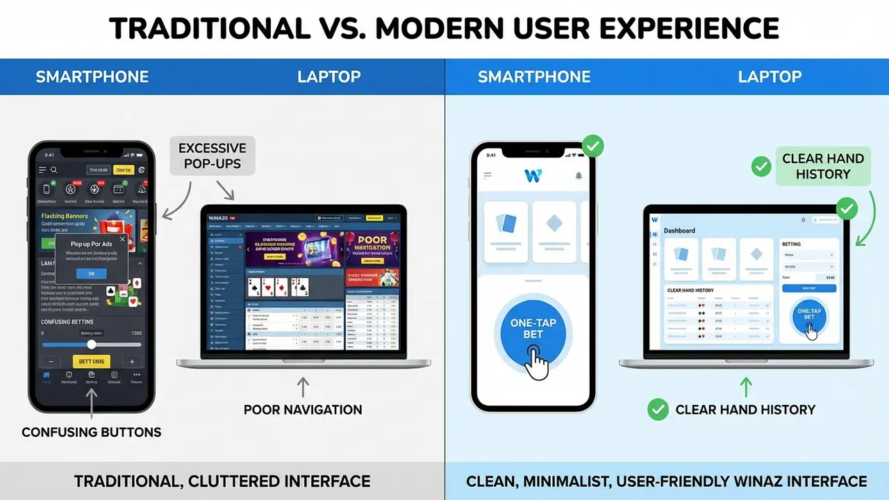 Ngay từ cái chạm đầu tiên, người chơi sẽ cảm nhận được sự khác biệt. Đội ngũ phát triển của Winaz đã ứng dụng triết lý thiết kế “vị nhân sinh”, đặt trải nghiệm người dùng làm trọng tâm. Giao diện được tinh giản tối đa, loại bỏ mọi chi tiết thừa thãi gây rối mắt. Các nút chức năng như Tố, Theo, Bỏ Bài, Cược được bố trí khoa học, với kích thước hợp lý, giúp game thủ thao tác nhanh và chính xác chỉ bằng một tay trên điện thoại. Công nghệ PWA (Progressive Web App) và HTML5 tiên tiến nhất đảm bảo trải nghiệm đồng nhất, mượt mà từ màn hình smartphone nhỏ gọn đến màn hình PC rộng lớn. Tốc độ tải bàn chơi gần như tức thì, không còn tình trạng giật, lag hay mất kết nối giữa ván đấu, giúp dòng cảm xúc của bạn không bao giờ bị đứt đoạn.