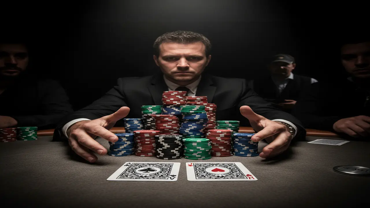 Hình ảnh một cao thủ bài bạc đang ngồi suy tư, điềm tĩnh trước một ván cược lớn.